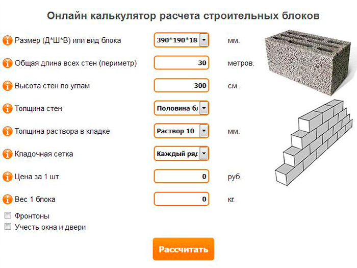 Если всего несколько лет назад расчеты предусматривали использования специальных формул, то сегодня можно использовать онлайн-калькулятор. Наиболее популярным сегодня можно назвать: http://stroy-calc.ru/raschet-blokov.