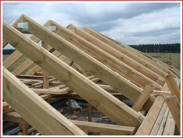 Стропильная система крыши каркасной бани из древесины (брус, доски).