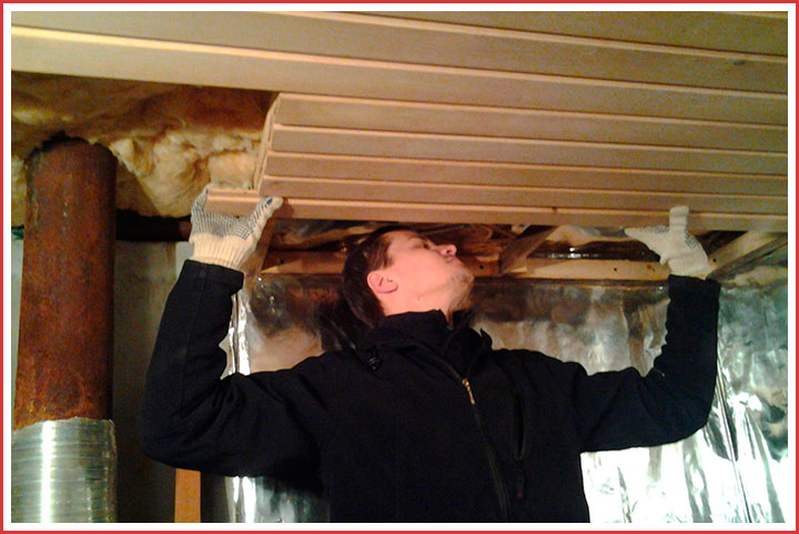 - Начинают с обшивки на внутреннюю часть потолка материалом ОСП или древесиной — это будет черновой потолок. Утепляется тремя слоями специальным противопожарным утеплителем. На стены так же идет – двумя слоями пергамин. В помещении – парной, дополнительно делается слой из фольгоизоли.