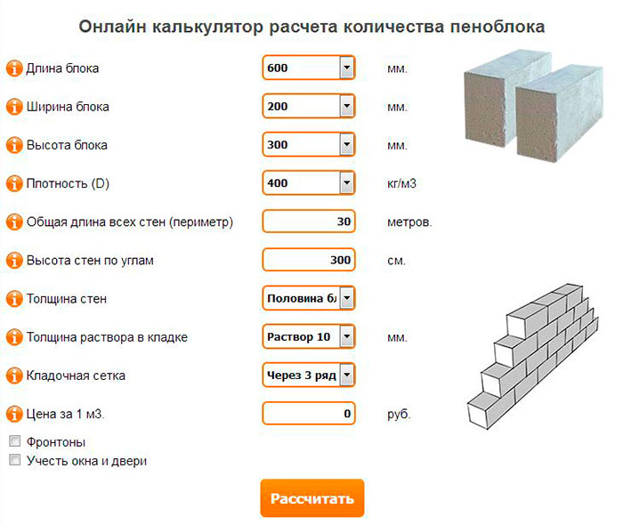 - В расчет берутся стандартные блоки с диной – 600, шириной – 200 и высотой -300 миллиметров. Их плотность – 400 кг./м3. Цена за 1 м3 пенобетонных блоков – 2000 руб.