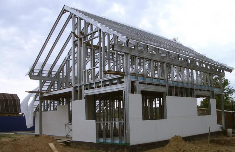 Металлический каркас собирают из перфорированного профиля, сделанного из низколегированной оцинкованной стали. Его толщина не превышает 3,5 мм. При этом, она одинакова, как для вертикальных, так и горизонтальных частей. Элементы соединяют, используя саморезы и заклёпки, иногда — сварку. Готовый каркас обшивается листами наиболее подходящего материала. Для такого дома подойдёт любой, из представленных на рынке.