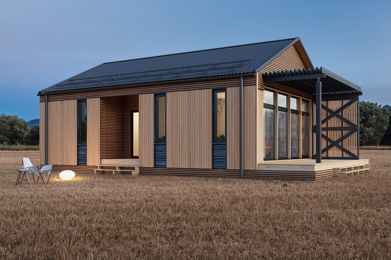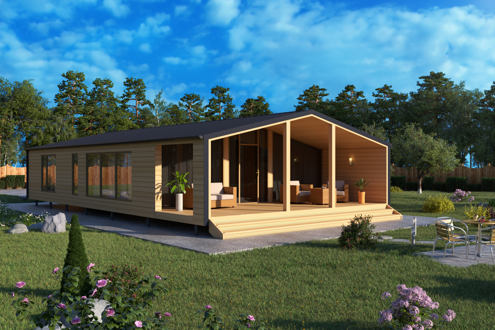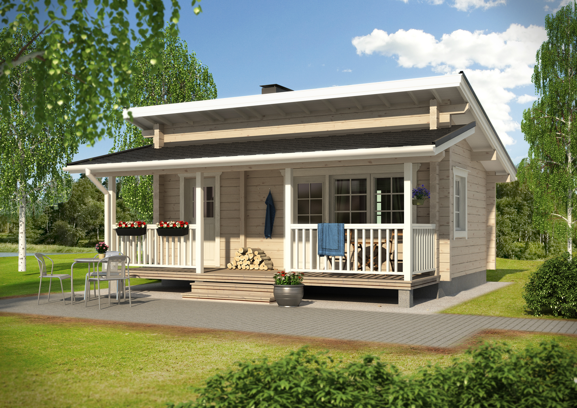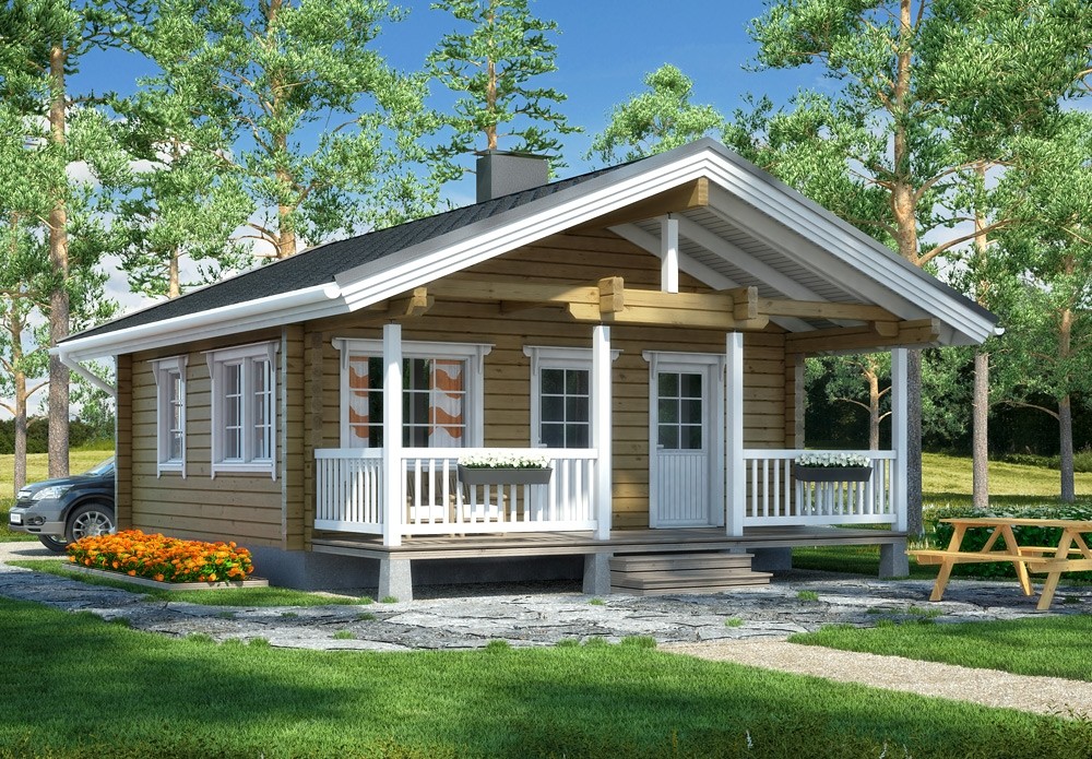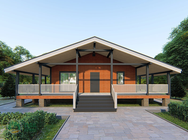 Самый популярный вариант планировки одноэтажного каркасного дома небольшой площади – с дополнительно пристроенной террасой. В летний период здесь можно не только комфортно проводить досуг, но и временно обустроить спальную зону.