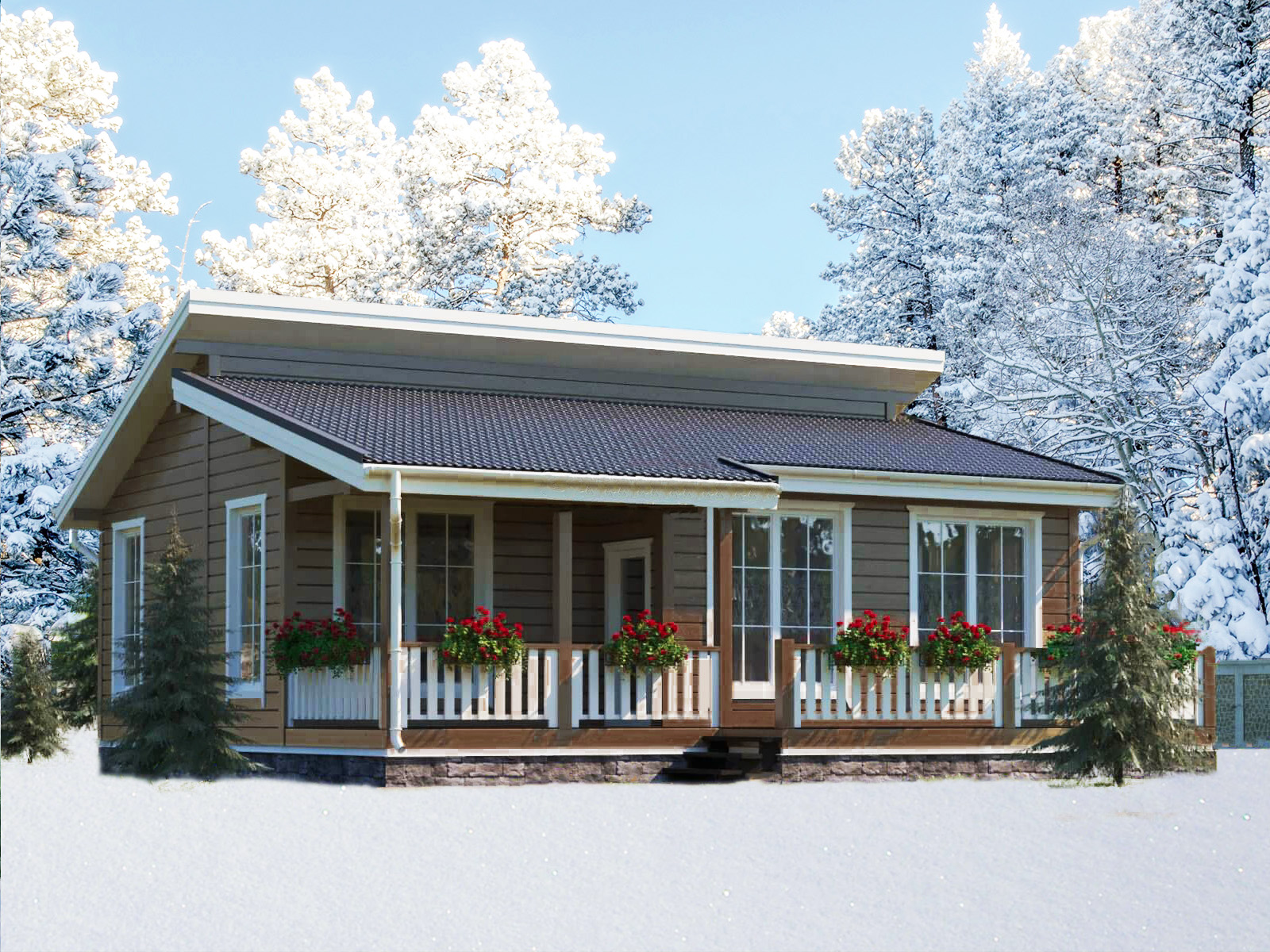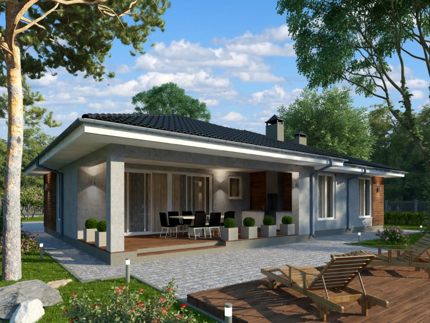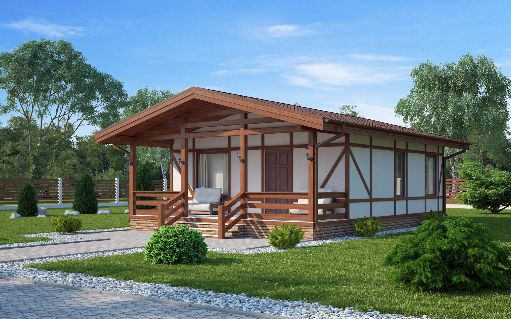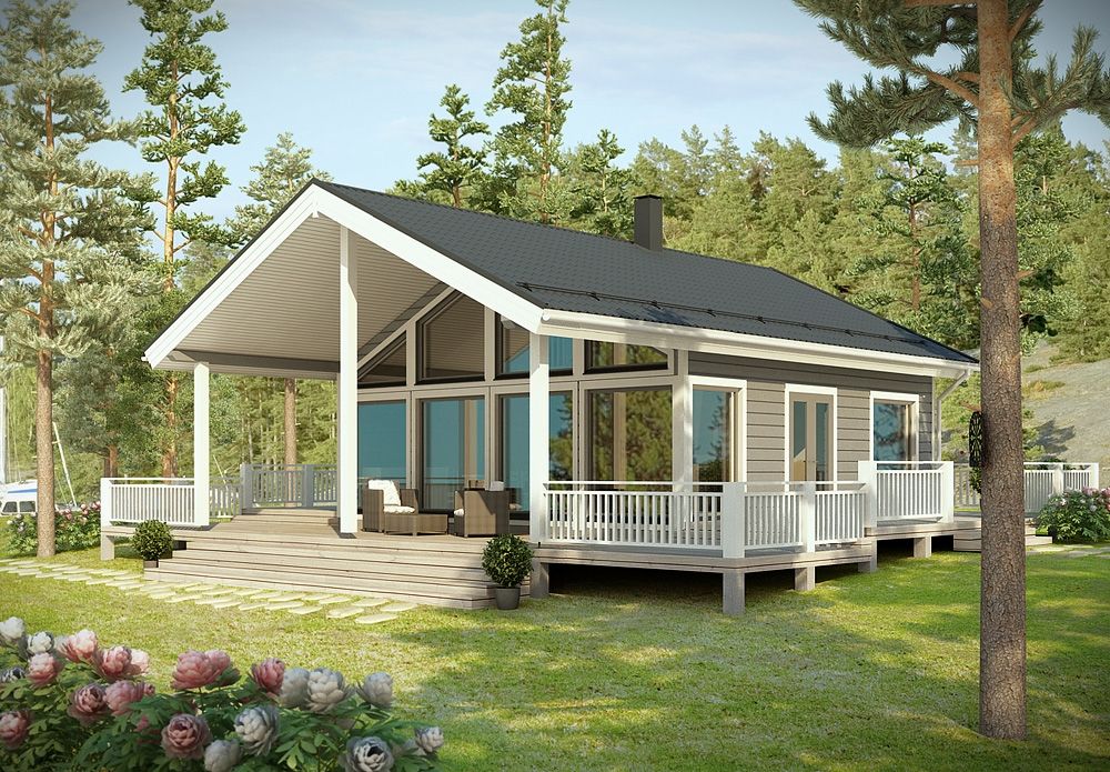 Одноэтажный каркасный дом с прилегающей к нему террасой пользуется сегодня большой популярностью не только в зарубежных странах, но и в России. Основными причинами такого спроса являются: быстрота возведения и доступная стоимость проектов. А пристроенная к дому терраса, защищенная от атмосферных осадков и солнечных лучей, позволяет владельцам загородного дома комфортно проводить время на свежем воздухе.