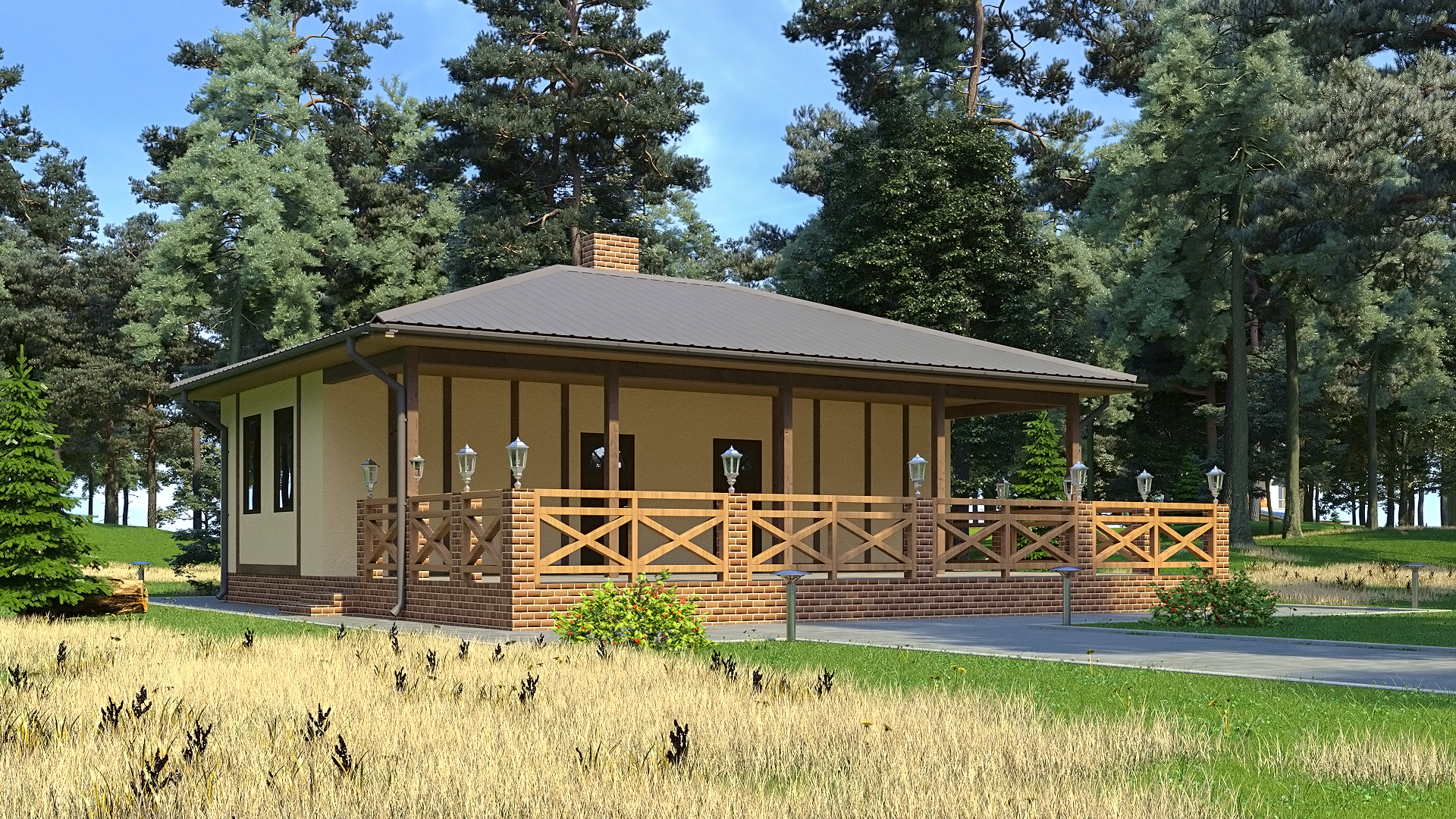 Проект одноэтажного жилого каркасного дома с дополнительно обустроенной террасой, отличается от аналогичной кирпичной или бетонной постройки незначительным весом. Это позволяет возводить каркасные постройки на легких фундаментах и существенно экономить на расходных материалах.