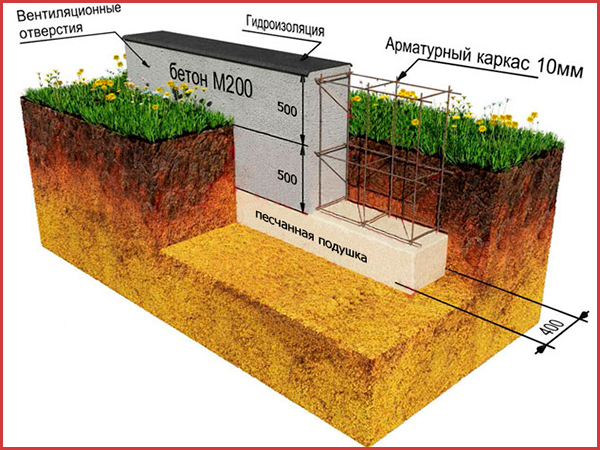 - Основа фундамента армируется, сечение проволоки должно быть не менее 12мм, размер полученных ячеек около 20х20см.